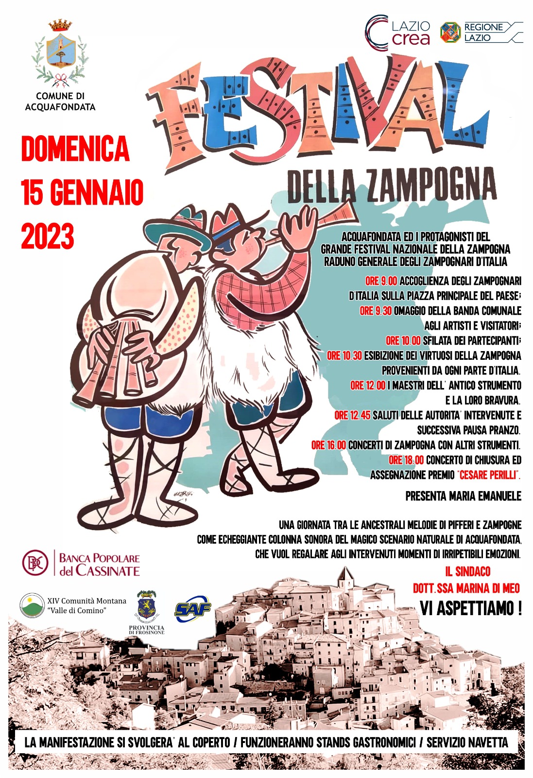 Si terrà Domenica 15 gennaio 2023 ad Acquafondata (Fr) l’edizione 2023 del Festival della Zampogna con il raduno generale degli zampognari d’Italia. Una festa speciale e un omaggio ad una straordinaria tradizione, che segna la storia, la cultura l’identità del nostro territorio. Uno scenario incantato, che verrà rallegrato dalle melodie di pifferi e zampogne, per un evento pieno di emozione.