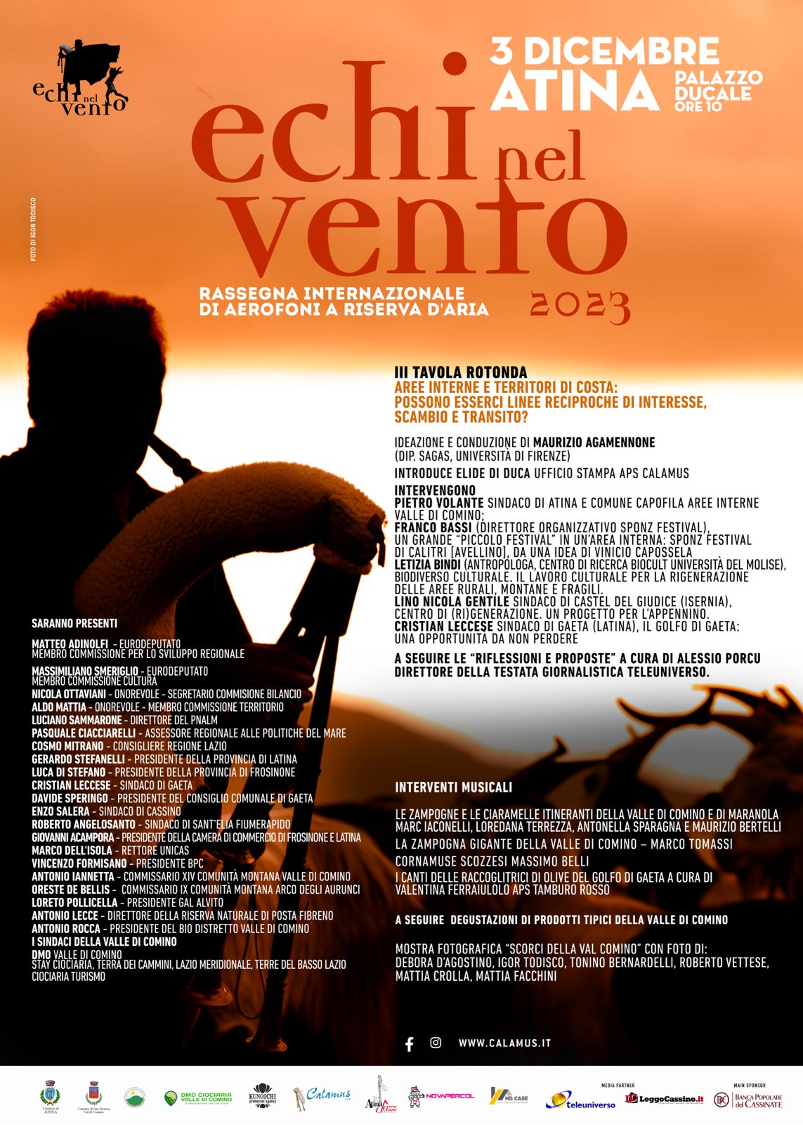 Si aprirà il prossimo 3 dicembre, nel Salone di Palazzo Ducale di Atina, il festival Echi nel vento, un’iniziativa sostenuta dalla XIV Comunità Montana Valle di Comino, dal Comune di Atina, dalla Banca Popolare del Cassinate e da numerosi partner ed enti istituzioni. Tanti gli ecenti in programma tra tra San Donato Val di Comino, Picinisco, Viticuso, Gaeta e la XII circoscrizione Trastevere di Roma.