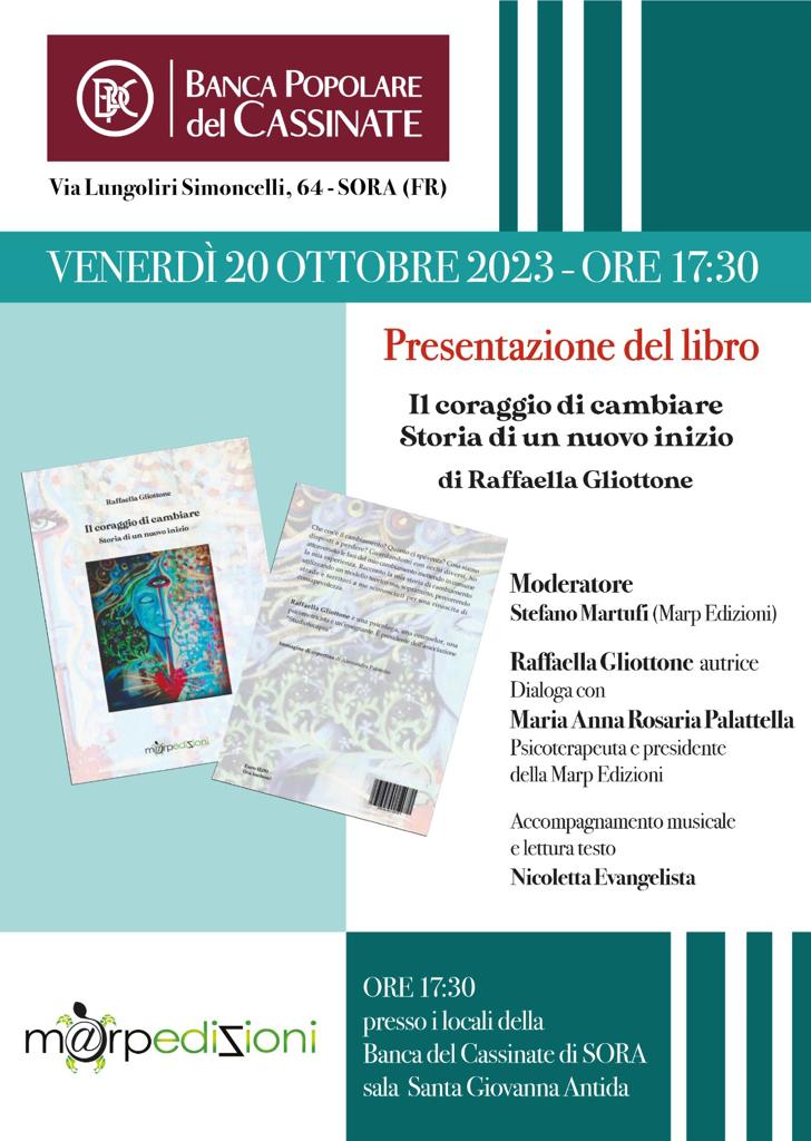 Venerdì 20 ottobre, alle ore 17:30, presso la filiale di Sora della Banca Popolare del Cassinate, nella sala Santa Giovanna Antida, ci sarà presentazione del libro “Il coraggio di cambiare. Storia di un nuovo inizio”, edito dalla Marp Edizioni, opera d’esordio di Raffaella Gliottone, psicologa, counselor, docente e Presidente dell’associazione Studiotecapiù. La prefazione è di Antonio Quaglietta, psicologo, fondatore e direttore dell’Accademia di Counseling Strategico Relazionale e del portale relazioniamoci.it. La postfazione è di Olimpia Armenante, psicoterapeuta e cofondatrice della Marp Edizioni.
