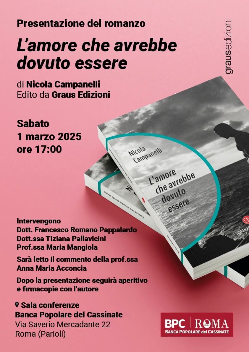 Verrà presentato sabato 1 marzo alle ore 17.00 nella Sala Conferenze della filiale di Roma di Banca Popolare del Cassinate in Via Mercadante, 22, il romanzo “L’amore che avrebbe dovuto essere”, di Nicola Campanelli edito da Graus Edizioni.