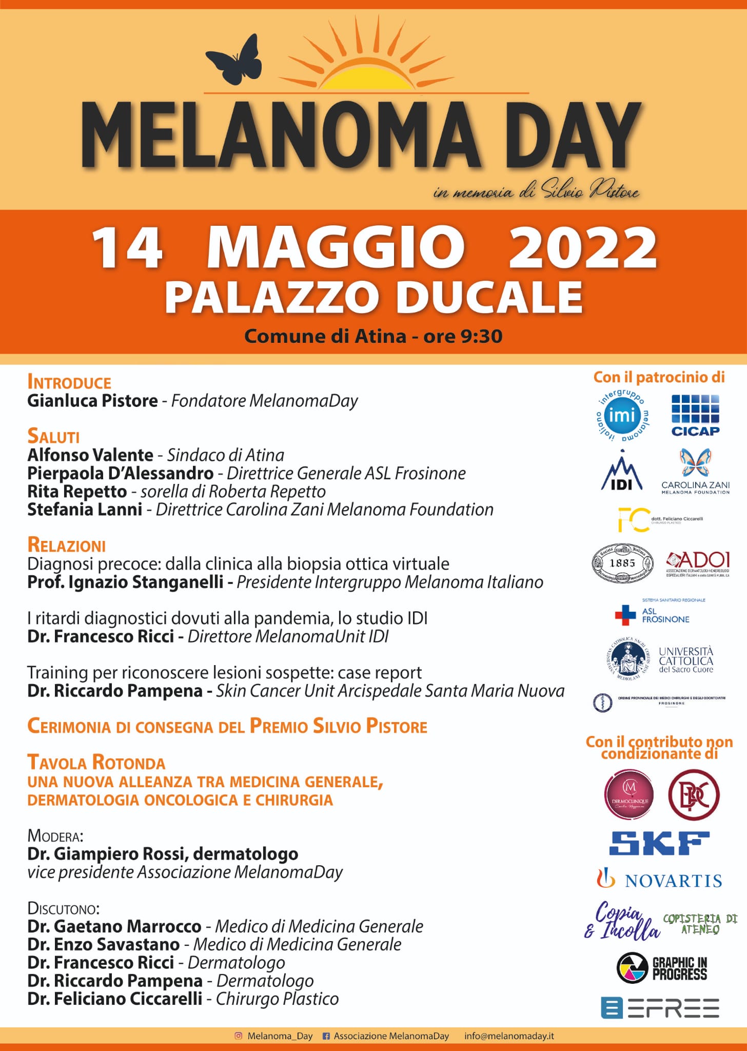 Un’iniziativa che gode di patrocini eccellenti: la Sidemast Società Italiana di Dermatologia medica, chirurgica, estetica e delle Malattie Sessualmente Trasmesse, l’IMI – Intergruppo Melanoma Italiano, l’ADOI Associazione Dermatologi Ospedalieri Italiani, l’IDI Istituto Dermopatico Immacolata, il CICAP, l’Università Cattolica del Sacro Cuore, facoltà di Medicina e Chirurgia, la Carolina Zani Melanoma Foundation, Feliciano Ciccarelli chirurgo plastico, l’Ordine dei Medici della provincia di Frosinone e la ASL Frosinone.