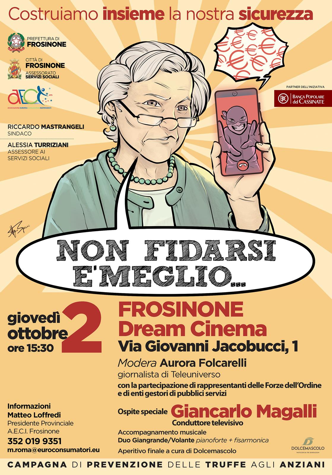 Tutto pronto per l’edizione 2025 di «Non fidarsi è meglio», la campagna di prevenzione contro le truffe agli anziani promossa dall’Assessorato ai Servizi Sociali – Distretto B e coordinata dall’Assessore avv. Alessia Turriziani, nato dal protocollo di intesa firmato dal Comune di Frosinone, guidato dal Sindaco Riccardo Mastrangeli, e dalla Prefettura di Frosinone, retta dal Prefetto dott. Ernesto Liguori. Il documento rafforza il duplice impegno delle due istituzioni: il Comune garantirà la cabina di regia territoriale, mettendo in campo operatori, strutture e risorse del Distretto B, mentre la Prefettura coordinerà le azioni interforze, assicurando la collaborazione di tutti i presìdi di sicurezza e il monitoraggio costante dei fenomeni di raggiro.