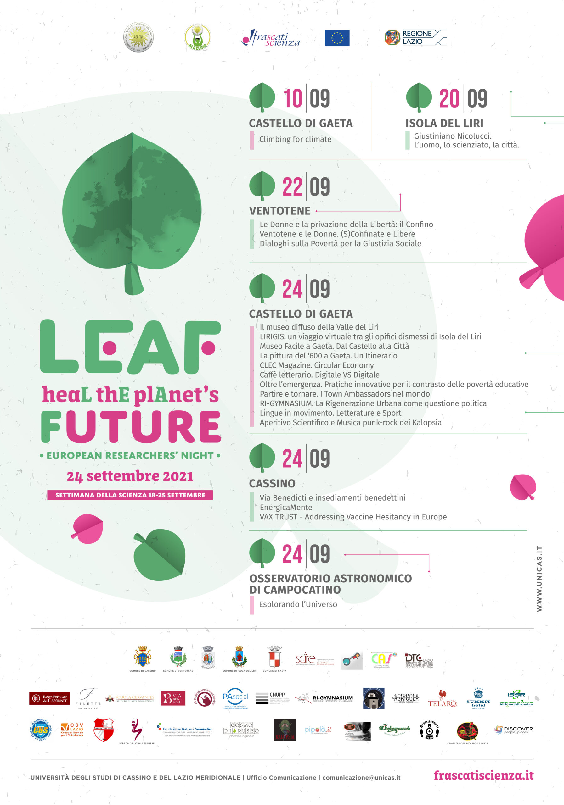 LEAF è finanziato dal programma HORIZON 2020 MSCA-NIGHT-2020 bis project n. 101036100 della Commissione Europea, nell’ambito delle azioni Marie Skłodowska-Curie e dalla Regione Lazio.
