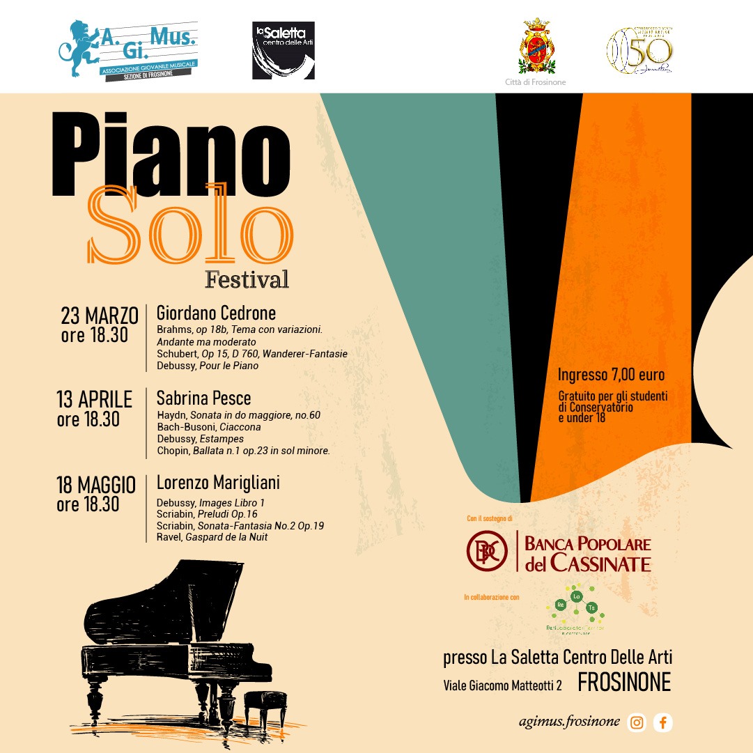 Piano Solo Festival inaugura la sua prima edizione 2024 nella città di Frosinone con un programma che prevede sette concerti, tre nei mesi di marzo, aprile e maggio e quattro nei mesi da settembre a dicembre, che si terranno presso La Saletta Centro delle Arti. A esibirsi saranno alcune giovani eccellenze del territorio, talentuosi studenti selezionati dal Conservatorio L. Refice di Frosinone, nel pieno spirito A.Gi.Mus., associazione che opera con successo già da qualche anno nella Provincia e che ha come mission la promozione di giovani artisti di valore, nonché la realizzazione di eventi culturali che incoraggino la condivisione artistica e sociale.