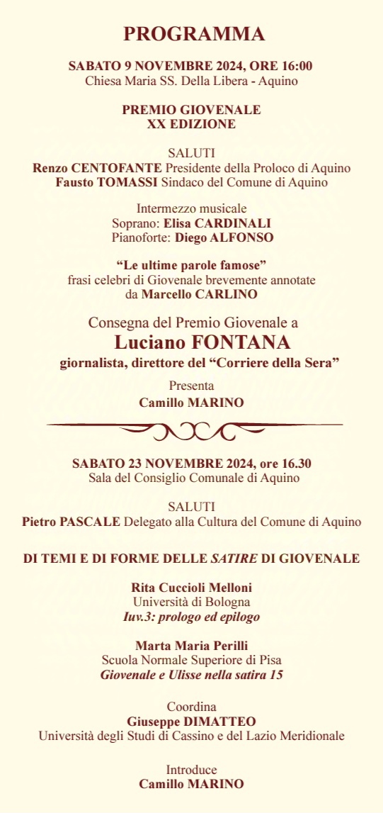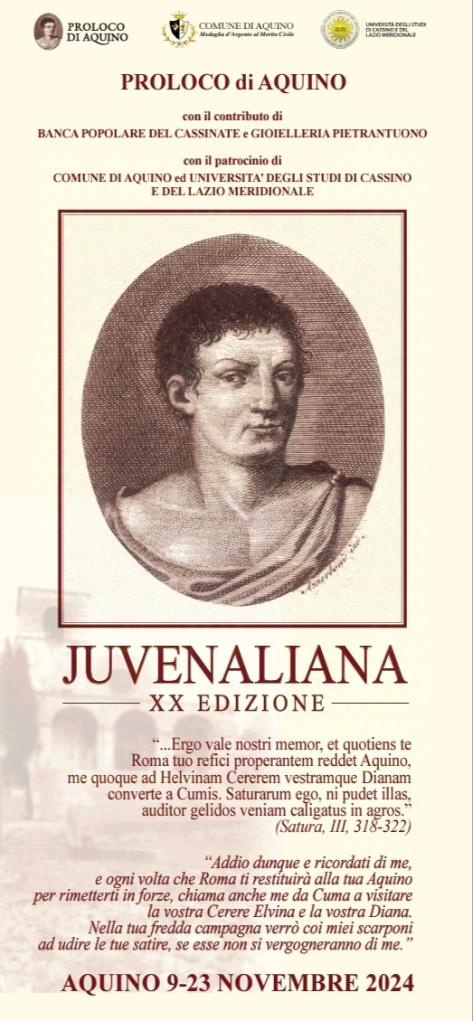Giunge all’importante traguardo della XX edizione il Premio Giovenale, prestigioso riconoscimento letterario organizzato dalla Proloco di Aquino, che dal 2005 vede sempre come assegnatari importanti personaggi della vita pubblica e culturale italiana tra i quali, per citarne solo alcuni, Luciano De Crescenzo, Nicola Gratteri, Piercamillo Davigo e Dacia Maraini. Il Premio fa parte di una manifestazione denominata Juvenaliana, dedicata all’illustre scrittore Decimo Giunio Giovenale – nato proprio ad Aquino tra l’anno 50 e il 60 dC- che si svolge lungo due giornate, la seconda delle quali imperniata su letture e discussioni riguardanti l’autore aquinate.
