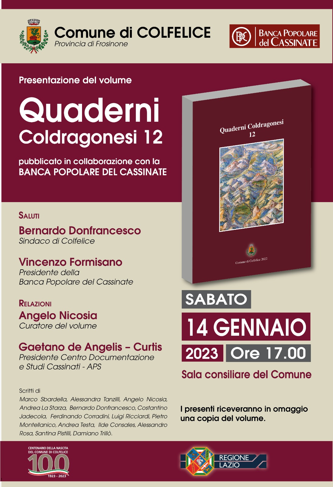 Sarà presentato sabato 14 gennaio 2023 alle ore 17.00 nella sala consiliare di Colfelice il dodicesimo numero dei Quaderni Coldragonesi. Un numero speciale che, ancora una volta, contiene studi preziosi e documenti originali sulla storia del territorio e che prosegue la tradizione dell’Amministrazione Comunale di valorizzare la storia, la cultura, le tradizioni di tutta la parte meridionale della provincia di Frosinone, che una volta andava sotto il nome di “Alta Terra di Lavoro”.