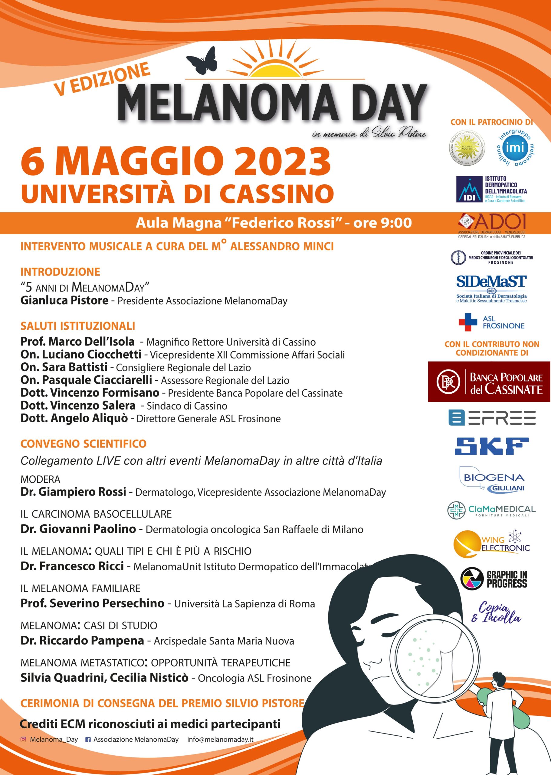 Il primo appuntamento è alle ore 9:00 nell’Aula Magna “Federico Rossi” dell’Università degli studi di Cassino, che ospiterà un evento dedicato ai Medici di Medicina Generale per imparare a riconoscere i soggetti e le lesioni più a rischio per i tumori cutanei. Ad aprire il convegno ci saranno le note musicali suonate dal Maestro Alessandro Minci; seguirà l’introduzione di Gianluca Pistore che racconterà i risultati dei primi cinque anni di MelanomaDay; subito dopo sarà il momento dei saluti istituzionali: il Prof. Marco Dell’Isola, Magnifico Rettore dell’Università di Cassino, l’On. Luciano Ciocchetti, Vice Presidente XII Commissione Affari Sociali della Camera dei Deputati, l’On. Sara Battisti, consigliere regionale del Lazio, l’On. Pasquale Ciacciarelli, Assessore regionale del Lazio, il Prof. Vincenzo Formisano, Presidente della Banca Popolare del Cassinate, il Dott. Enzo Salera, Sindaco di Cassino e il Dott. Angelo Aliquò, Direttore Generale della ASL di Frosinone.